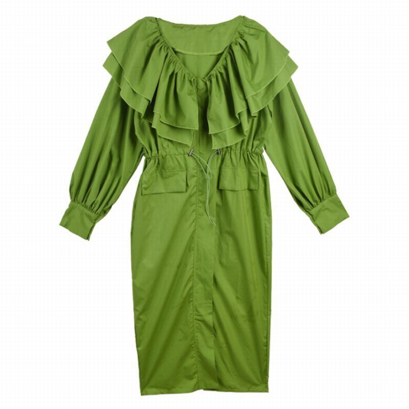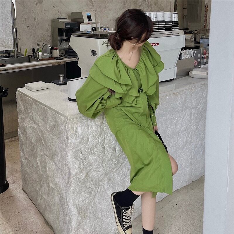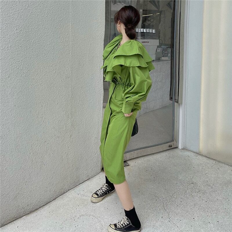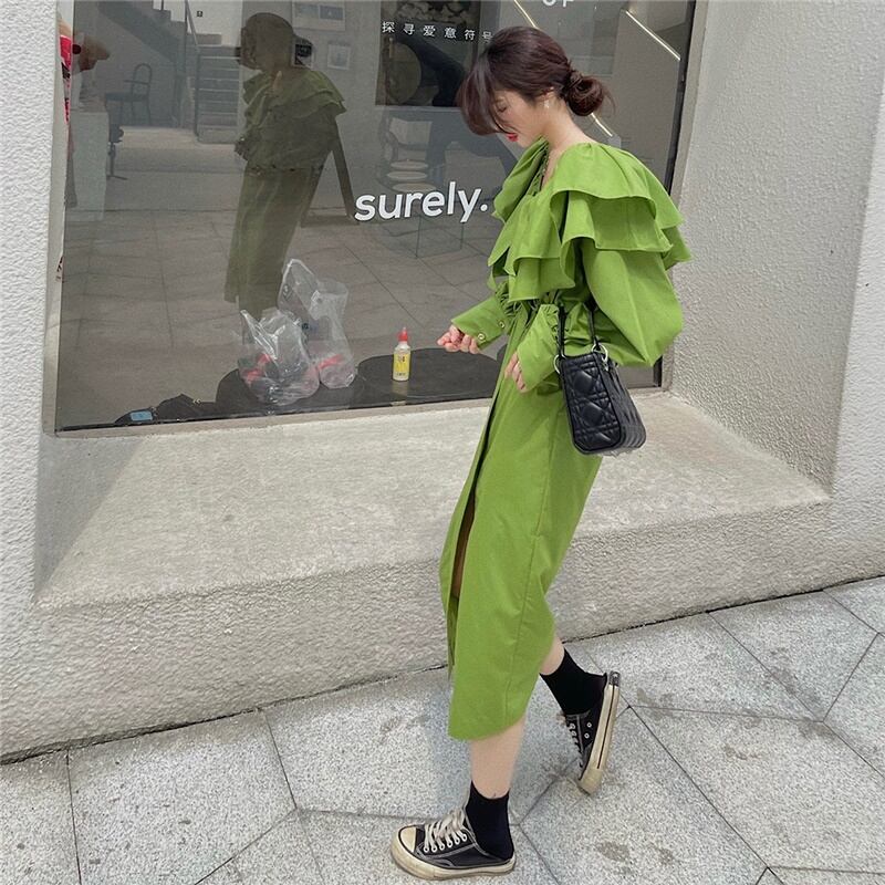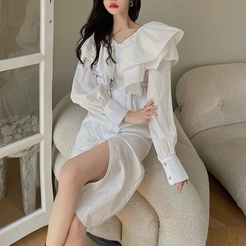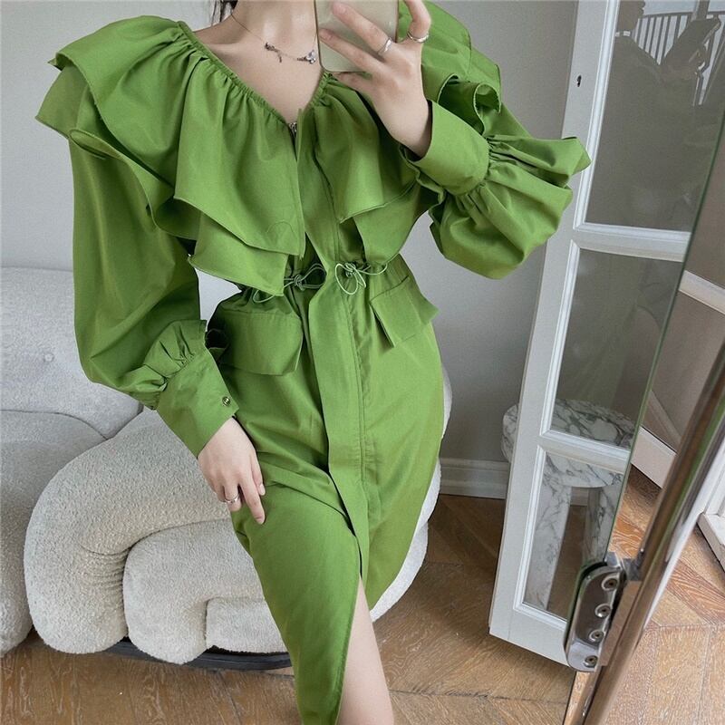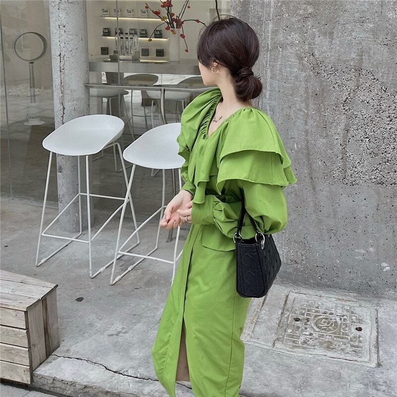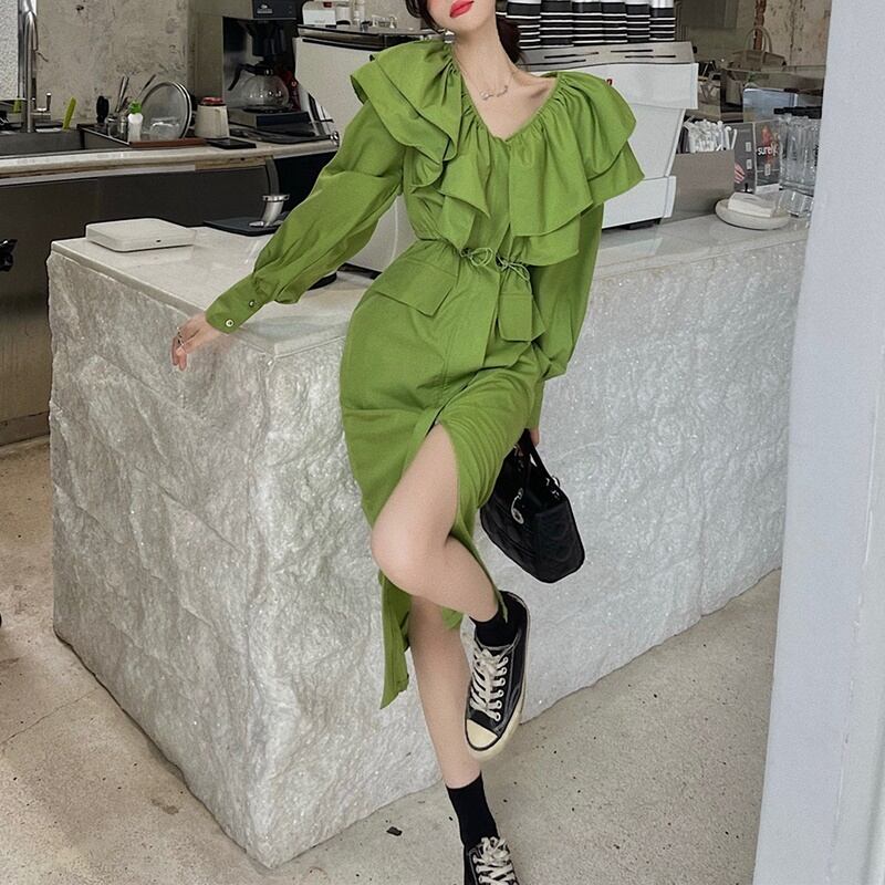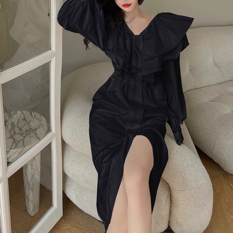3カラー フリル Vネック 長袖 スリット ワンピース *on775