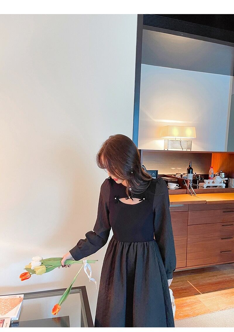 バスト部分が開いてほんのり色っぽさをプラスした大人に似合う上品デザイン。