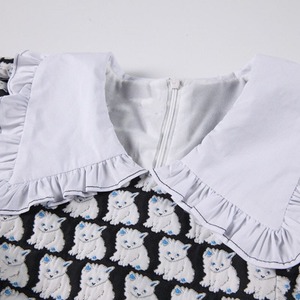 猫柄の生地がキュート。襟と袖のフリルがアクセントになっています。