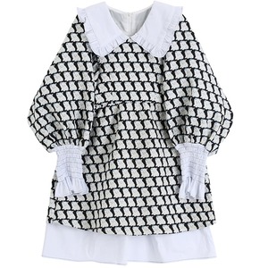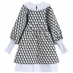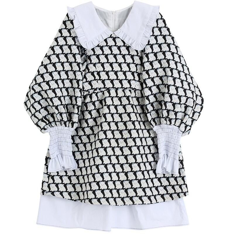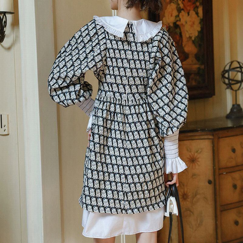 猫柄 Vネック フリル襟 長袖 ワンピース *on781