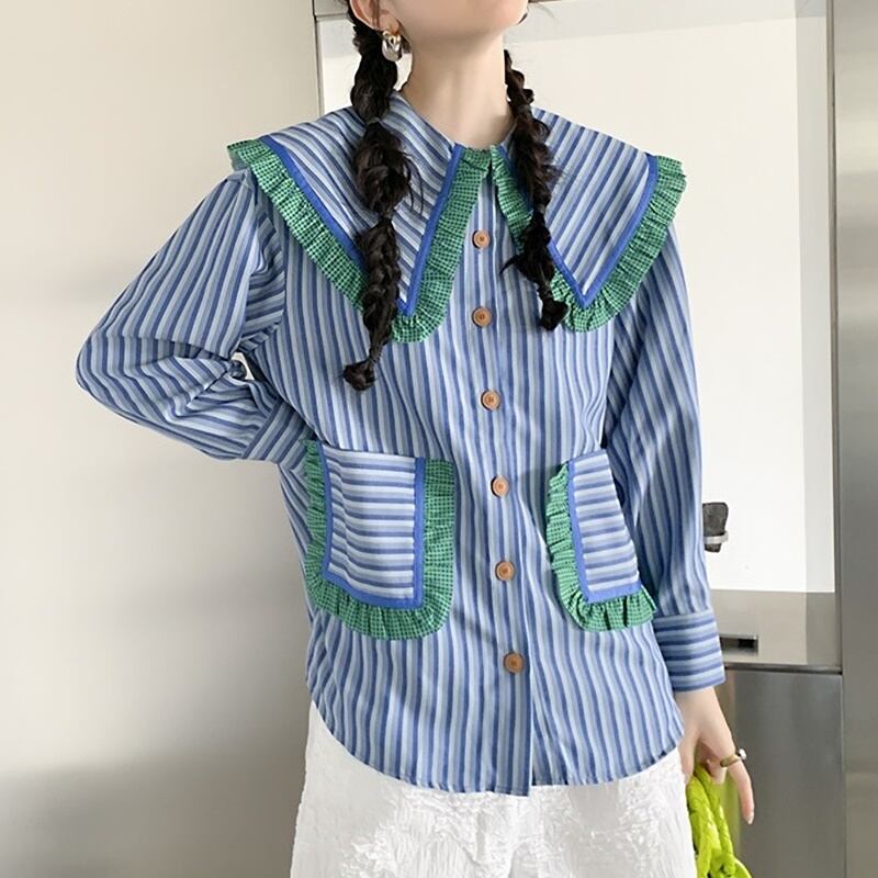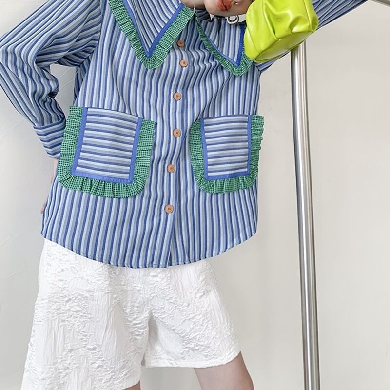 ストライプ柄 ポケット フリル 長袖 シャツ ブラウス *bl411