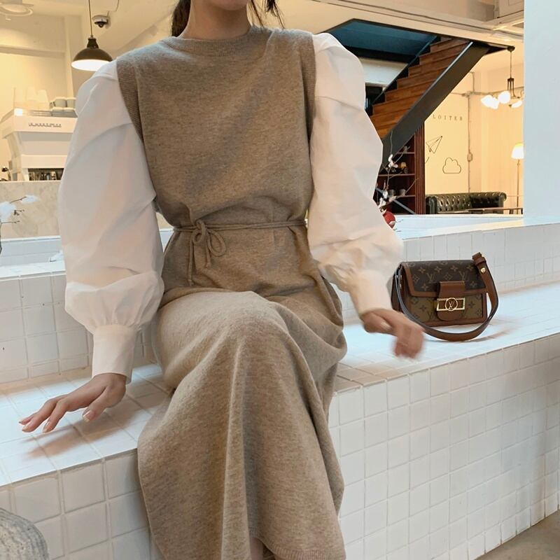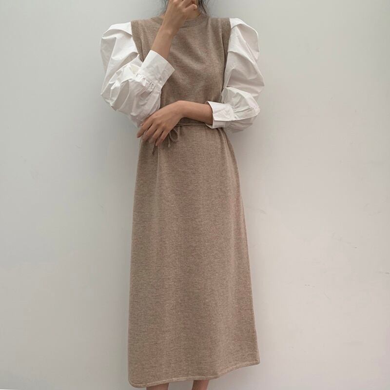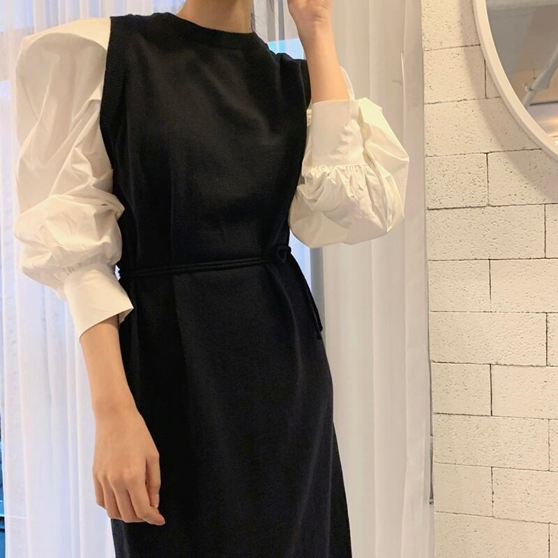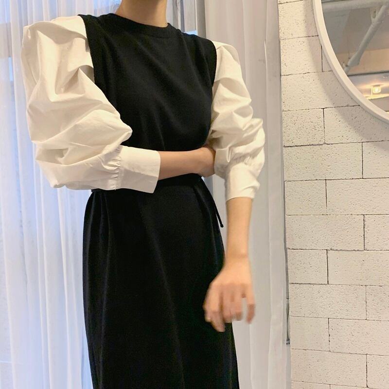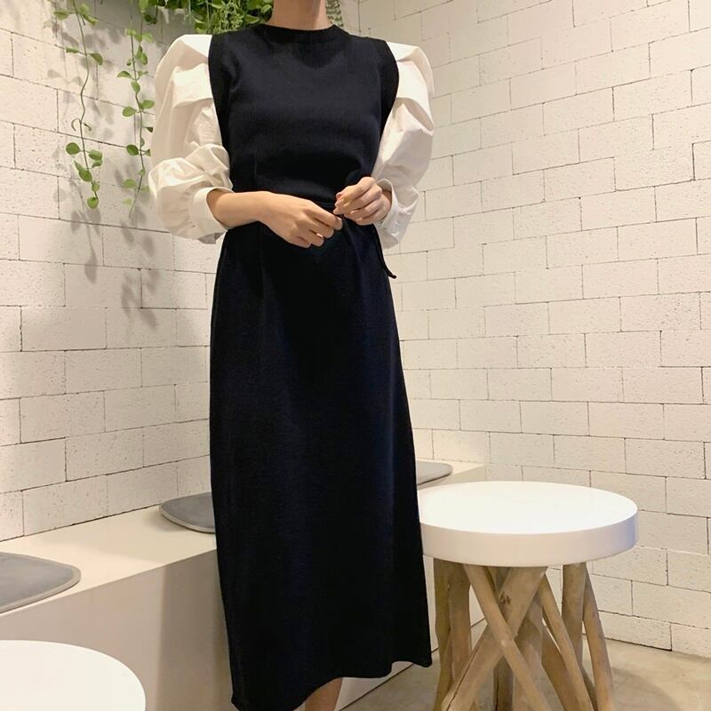 2カラー フェイクツーピース ボリューム袖 長袖 ワンピース *on795