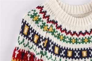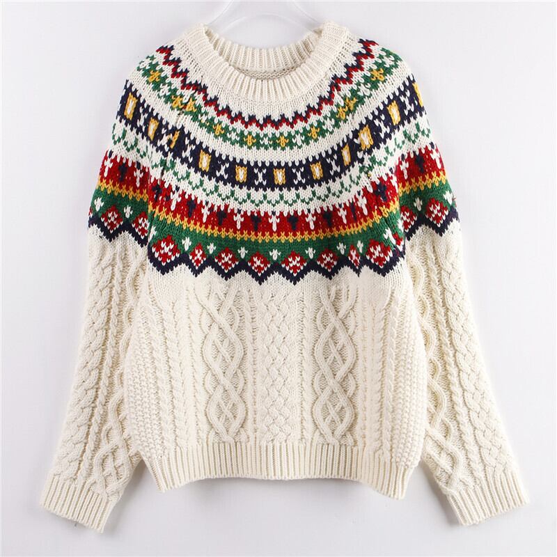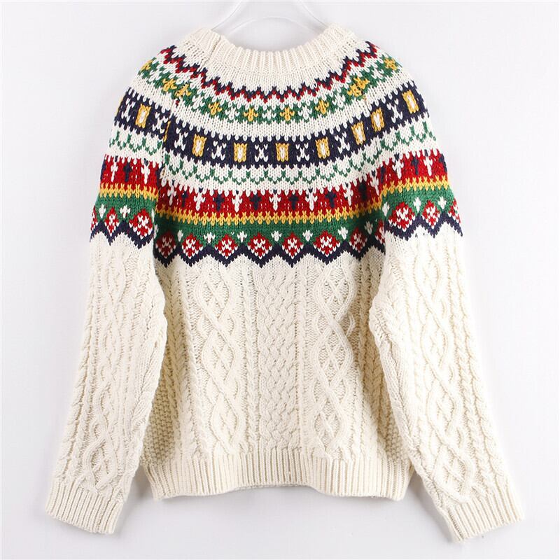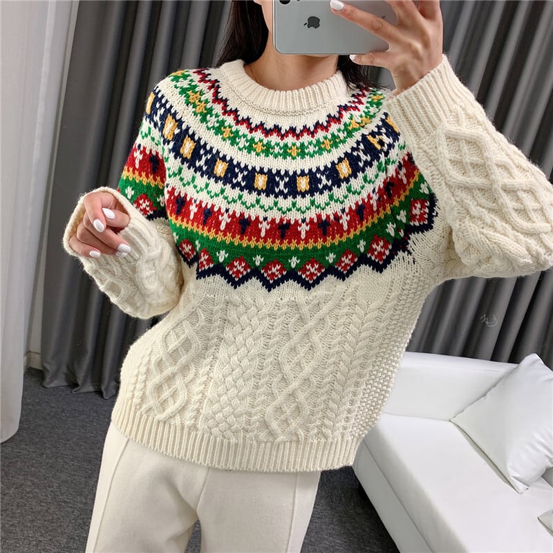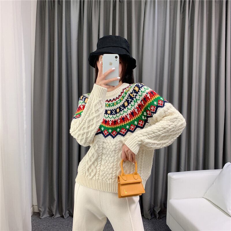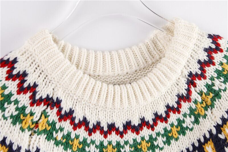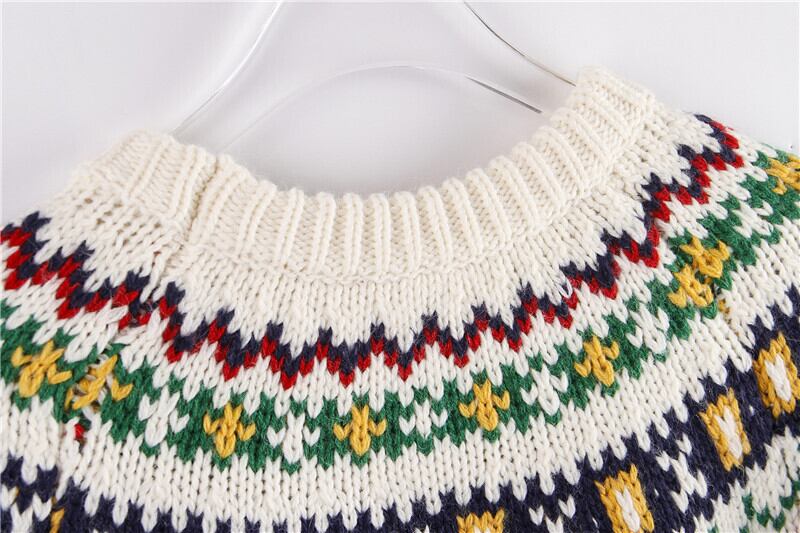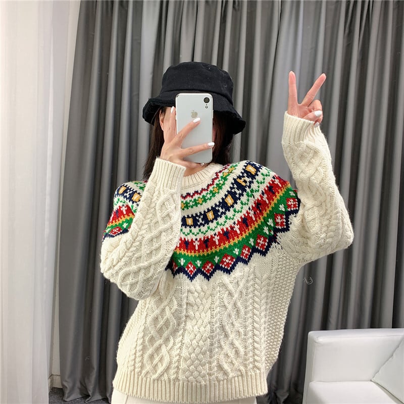 レトロ柄 刺繍 ラウンドネック 長袖 ニット セーター *ks131