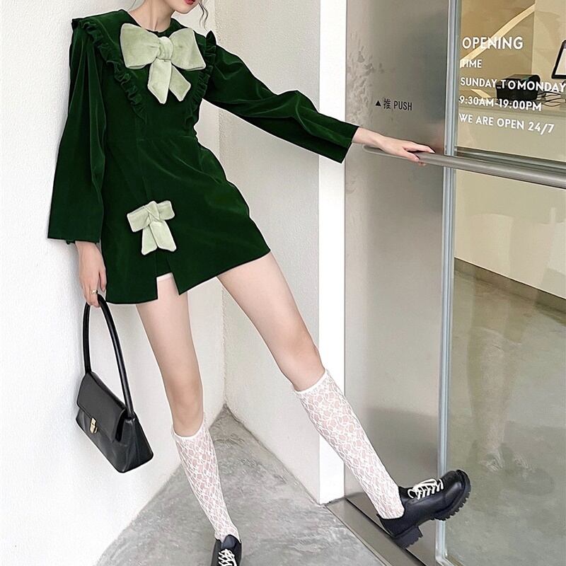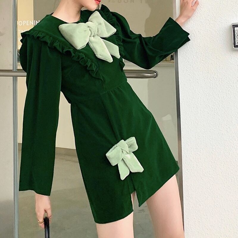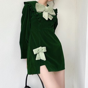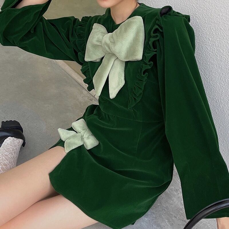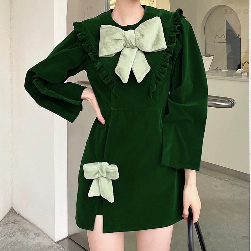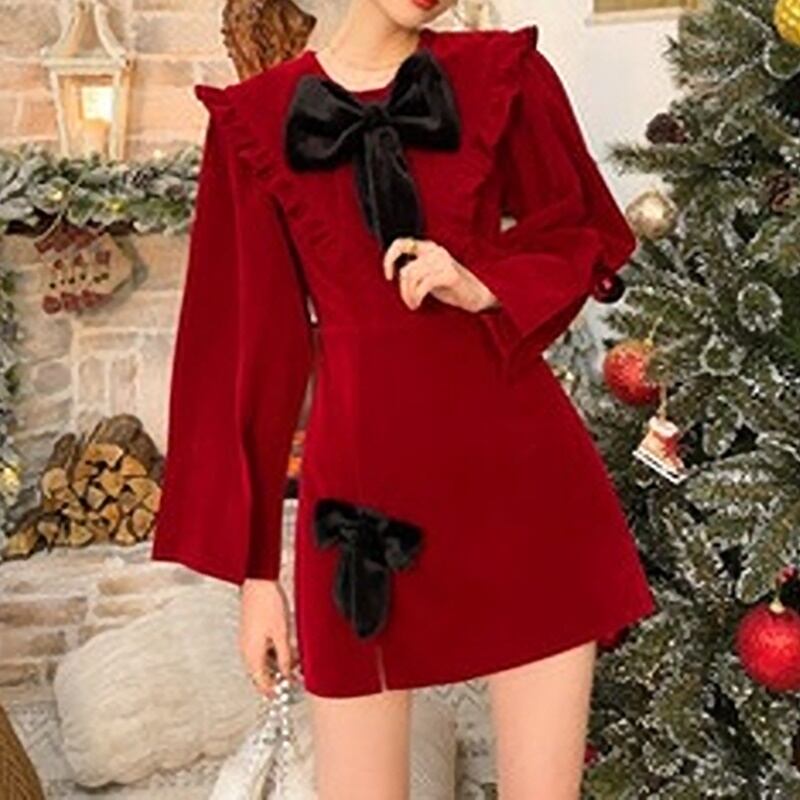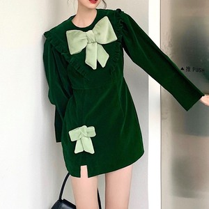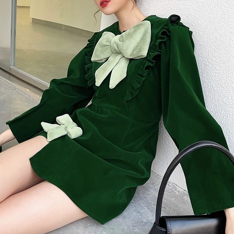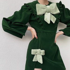 2カラー ベルベット 長袖 ラウンドネック リボン ワンピース *on796