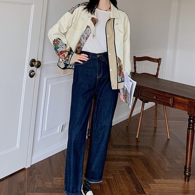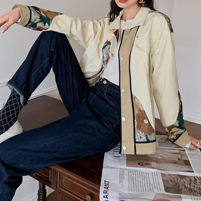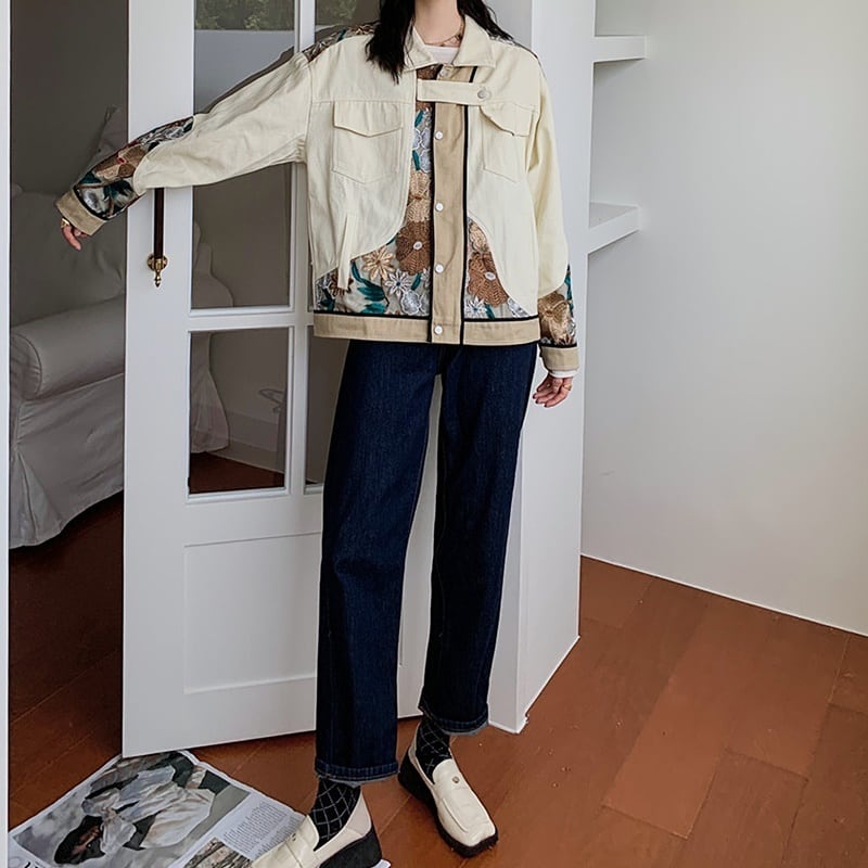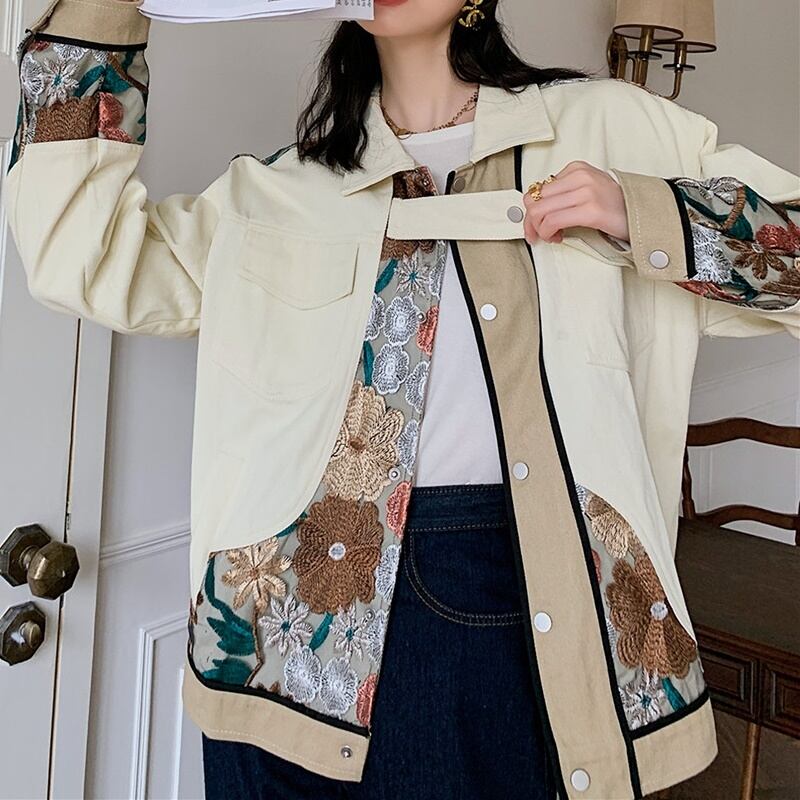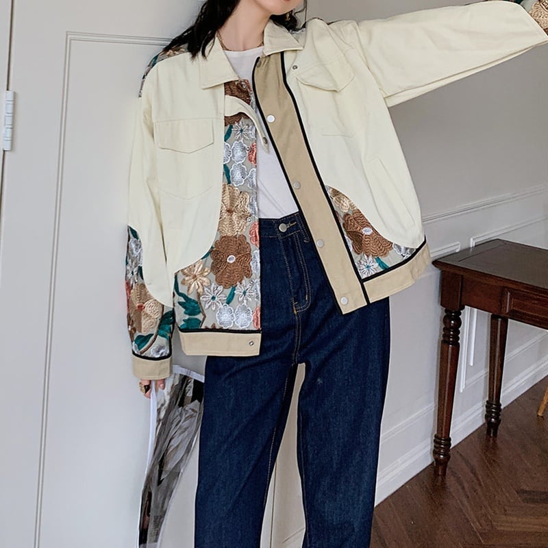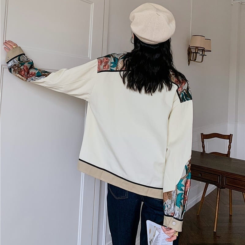 レトロ 花柄 刺繡 切り替え 長袖 ジャケット *ja071