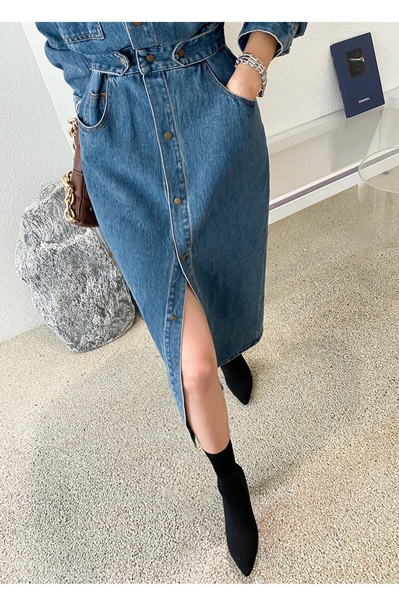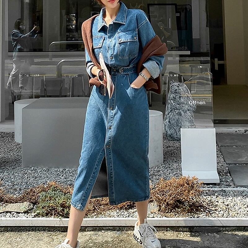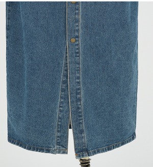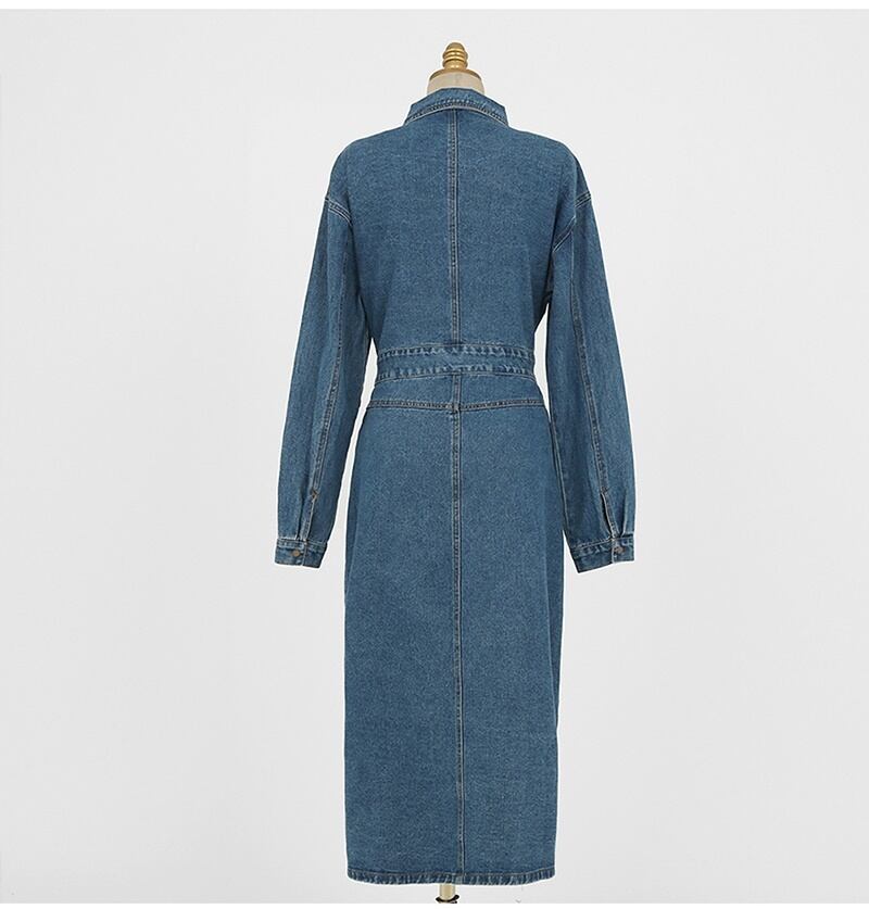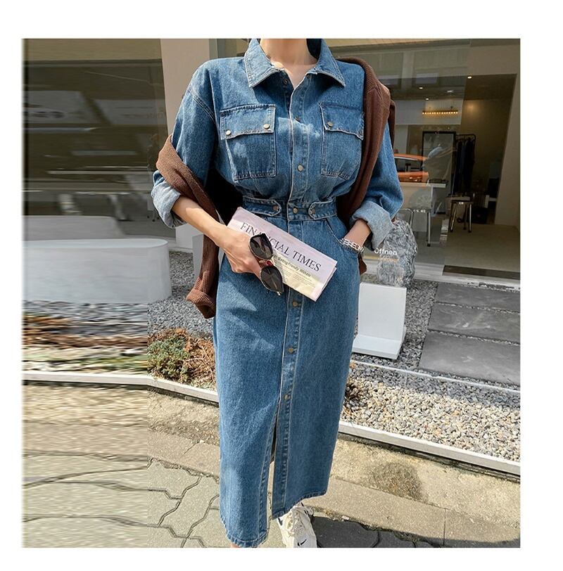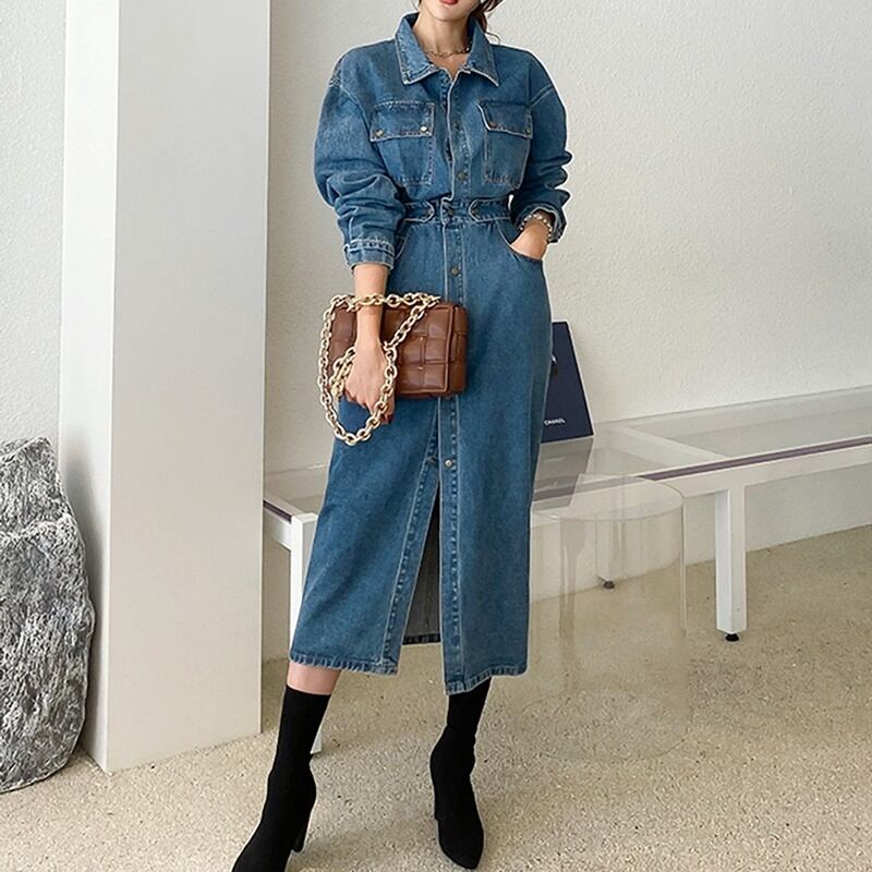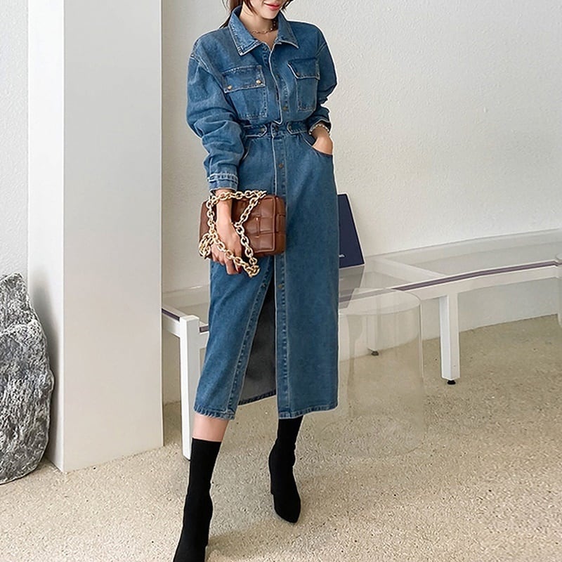 デニム 長袖 スリット ロング丈 ワンピース *on807