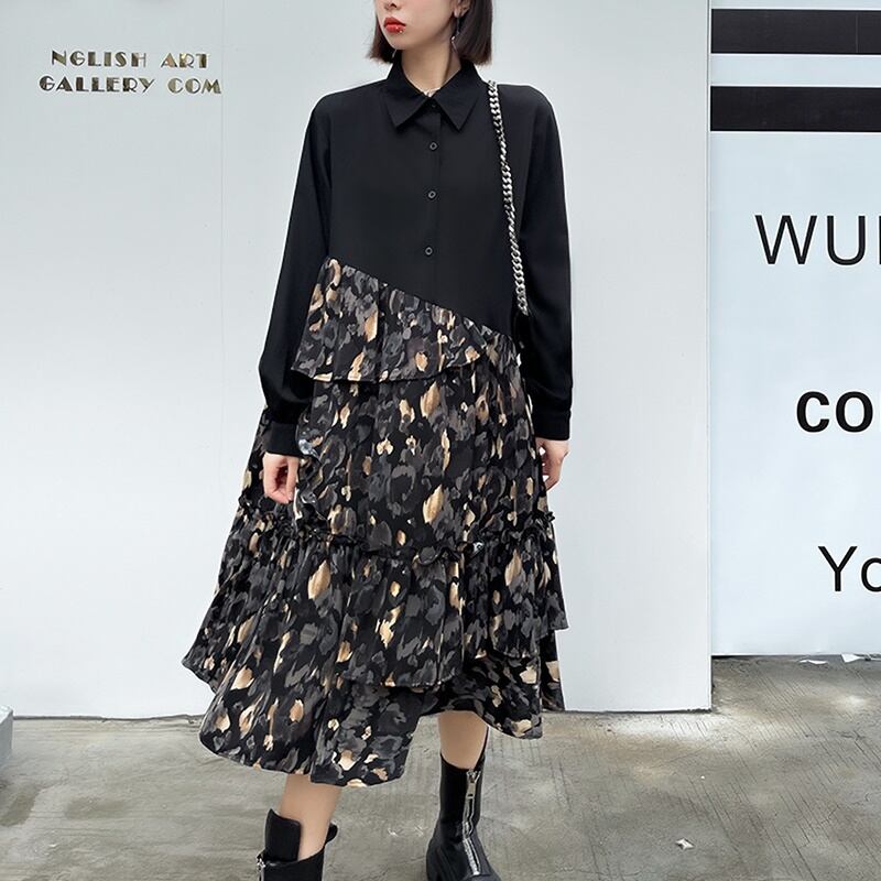 長袖 花柄 アシンメトリー 切り替え シャツワンピース *on812