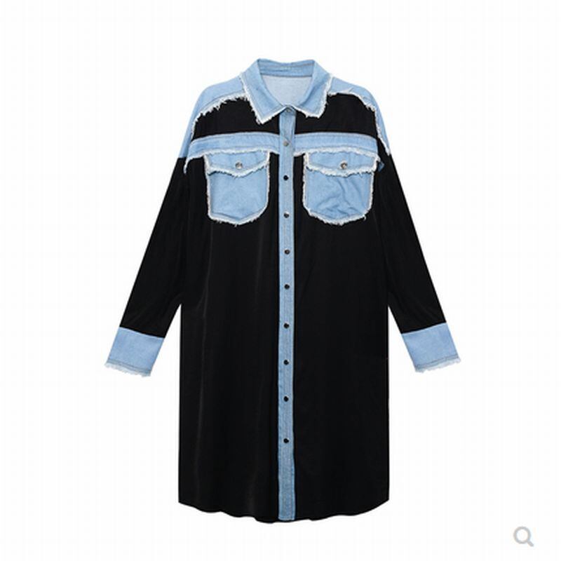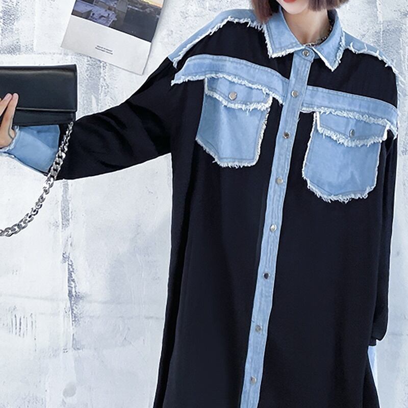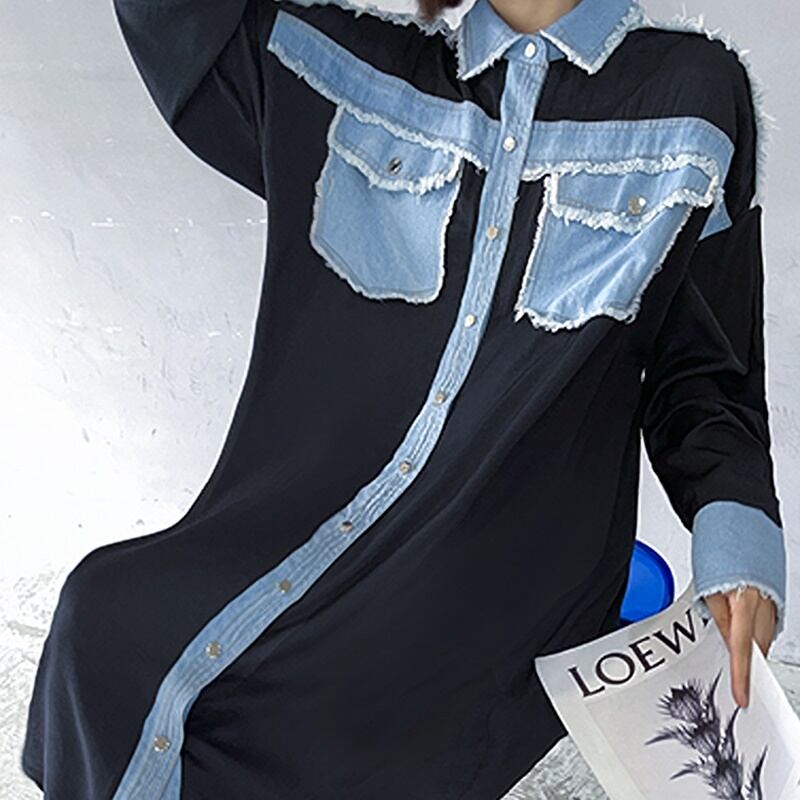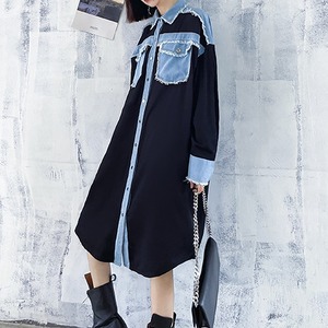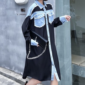 長袖 デニム バイカラー 切り替え シャツワンピース *on813