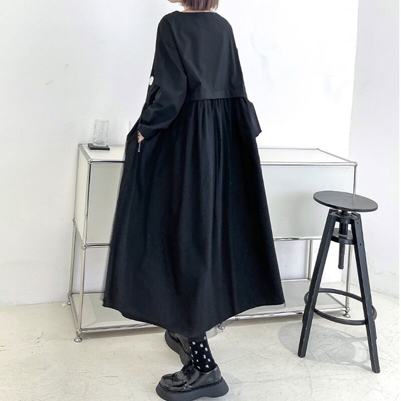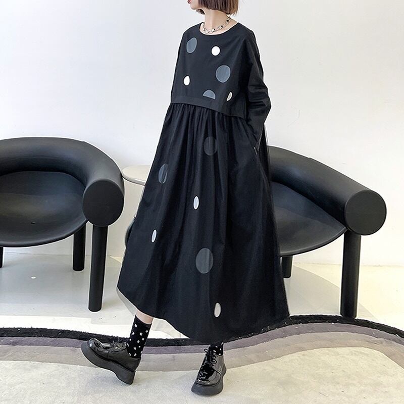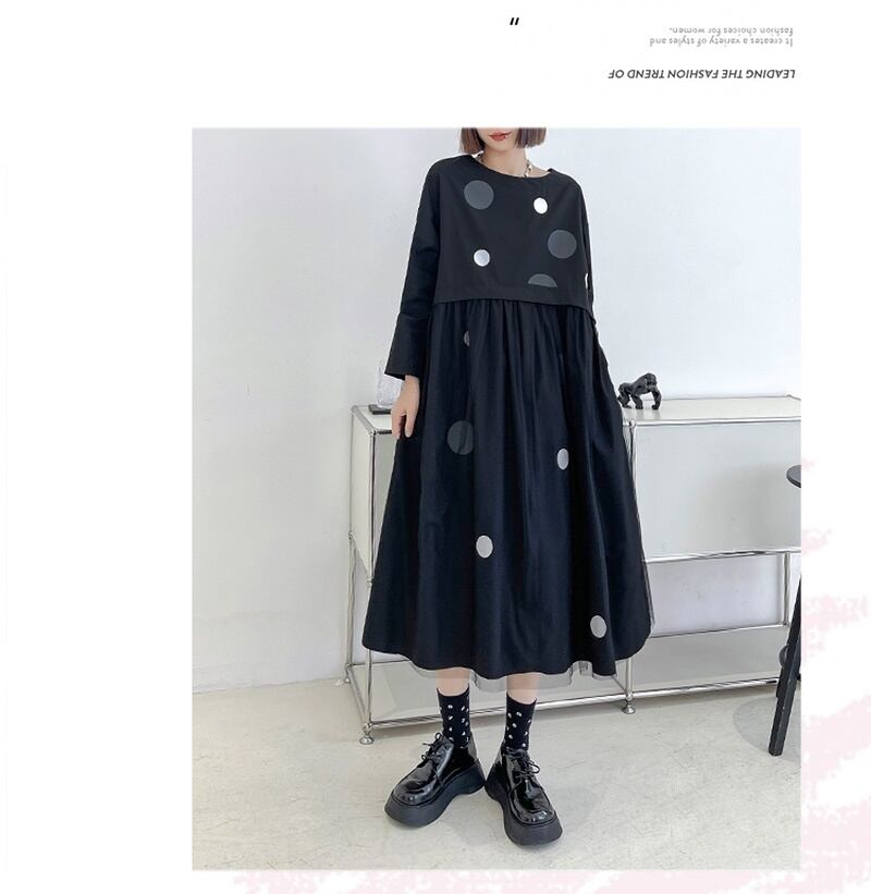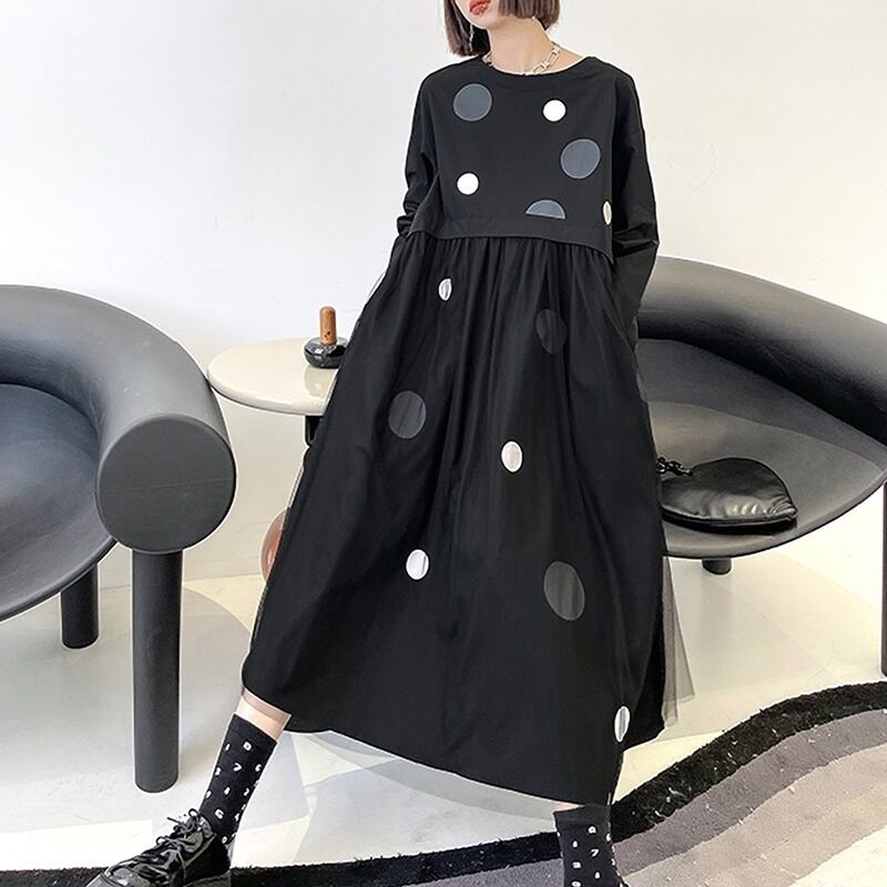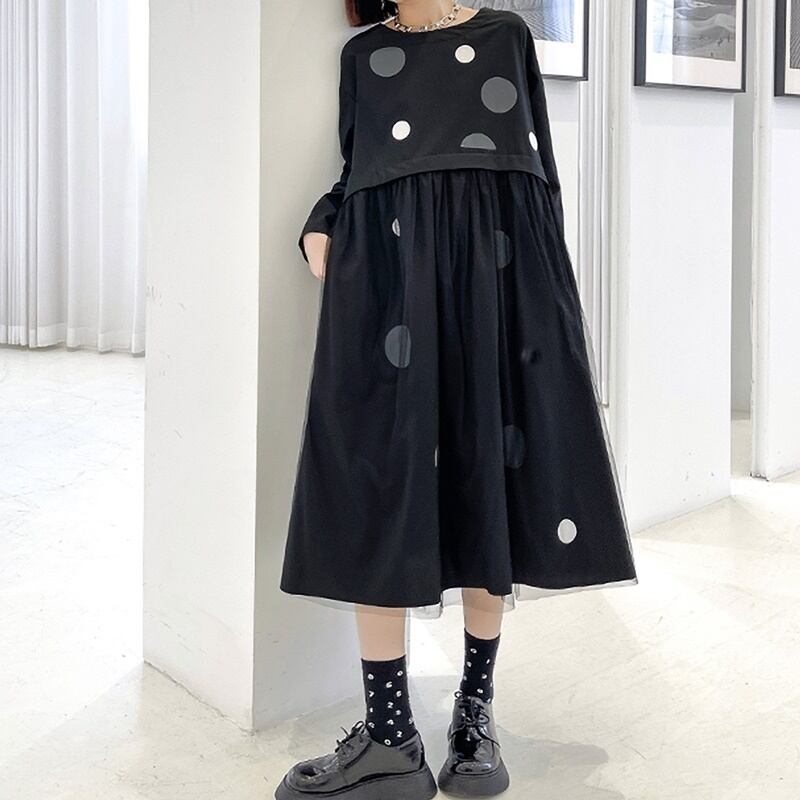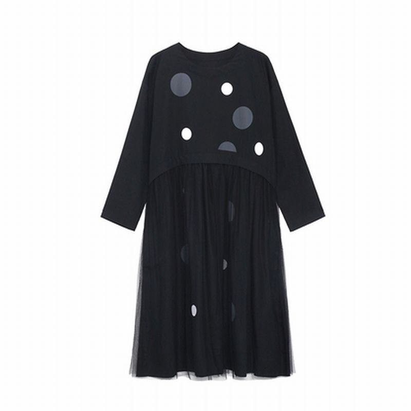 ドット柄 ラウンドネック 長袖 切り替え メッシュ ワンピース *on818