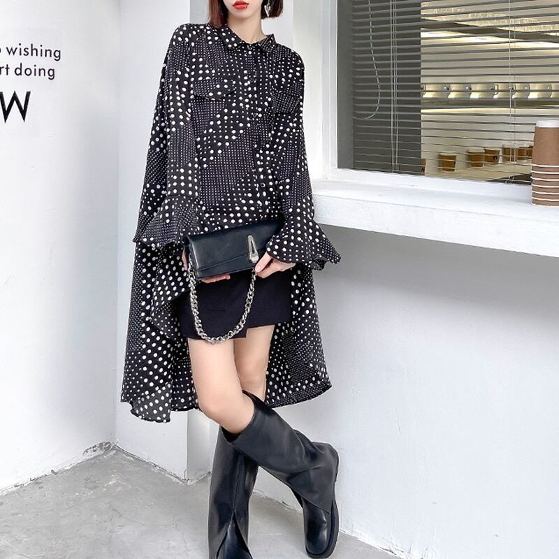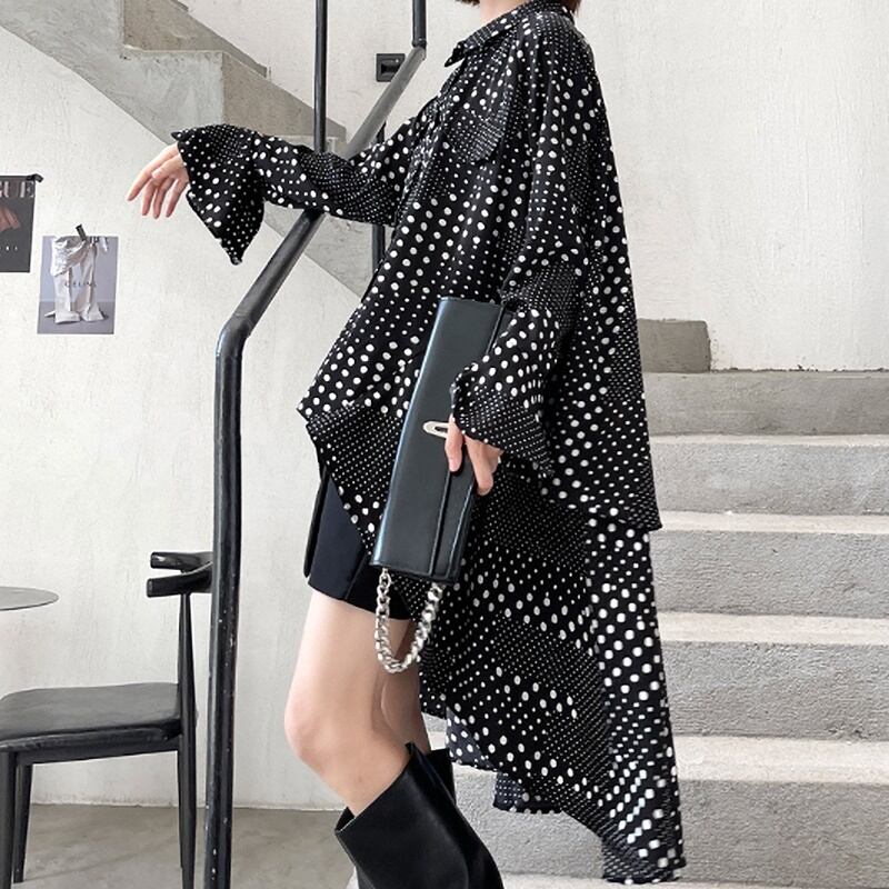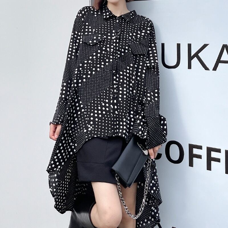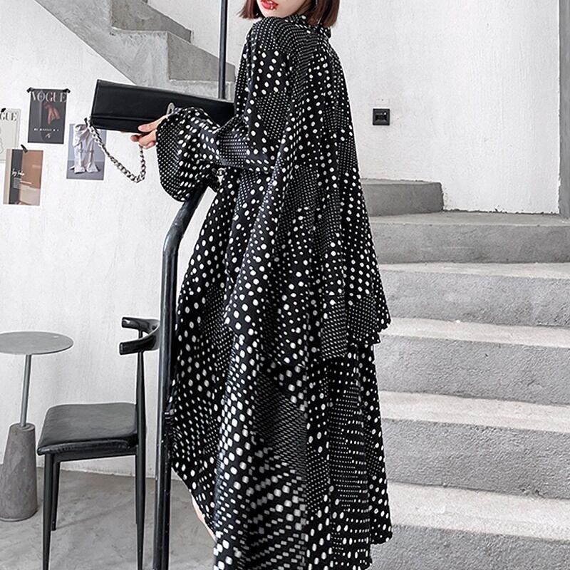 ドット柄 長袖 アシンメトリー シャツワンピース *on820