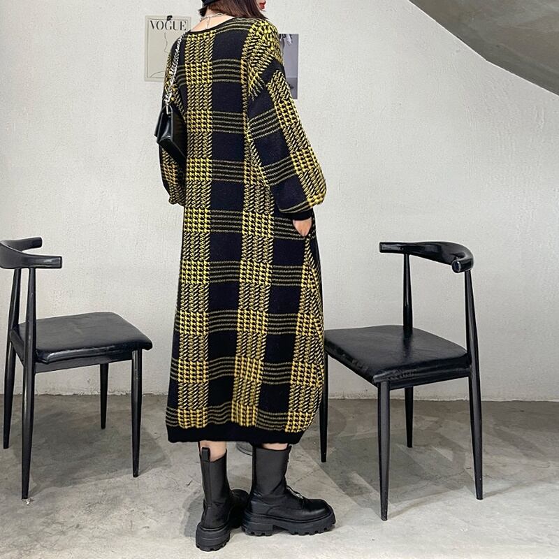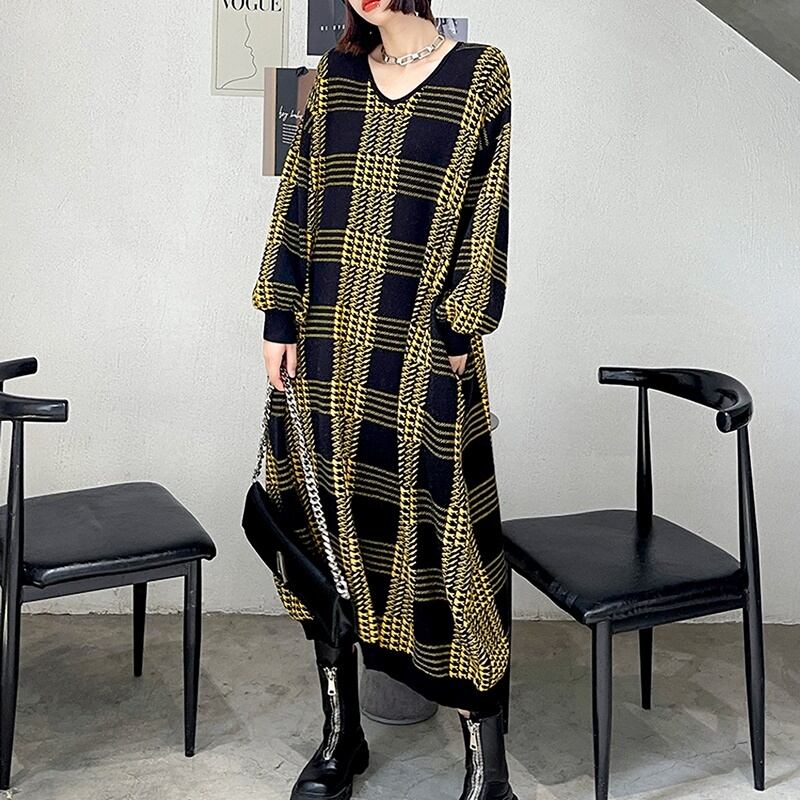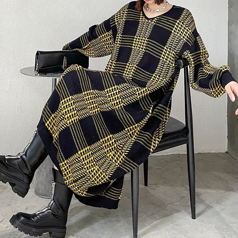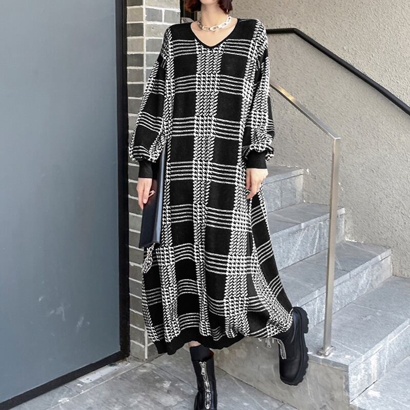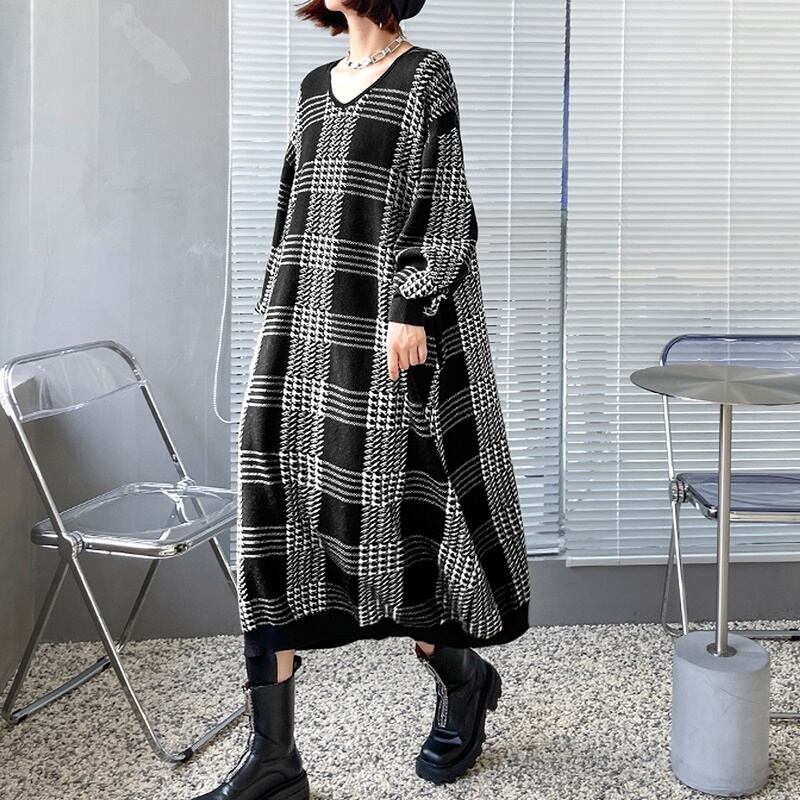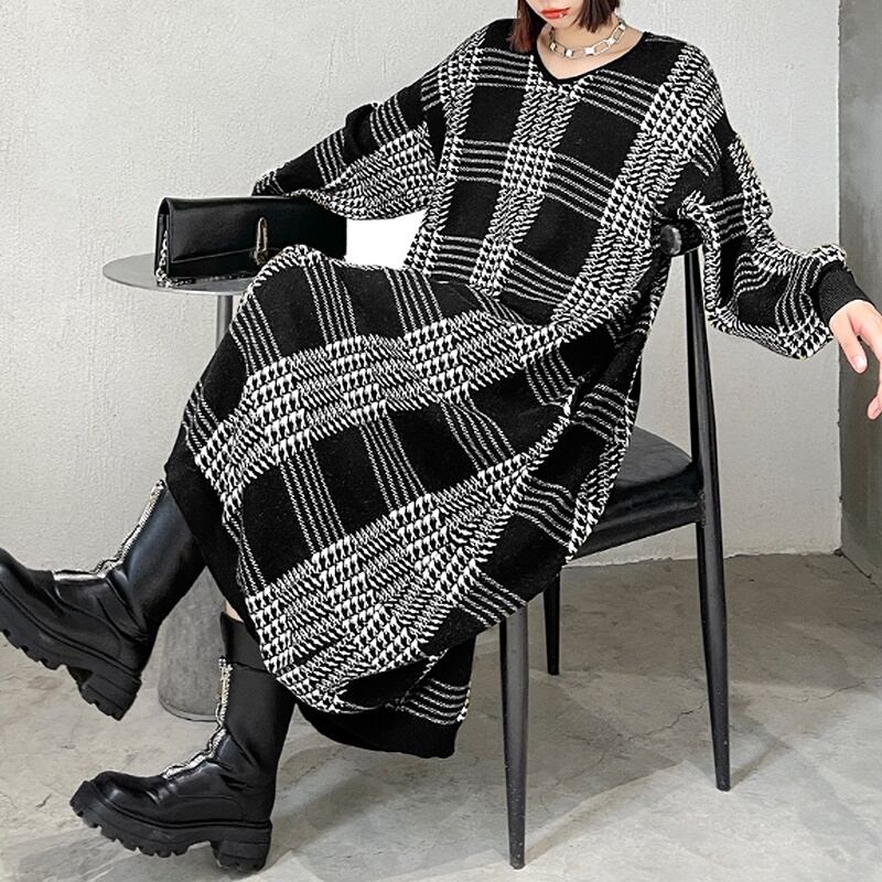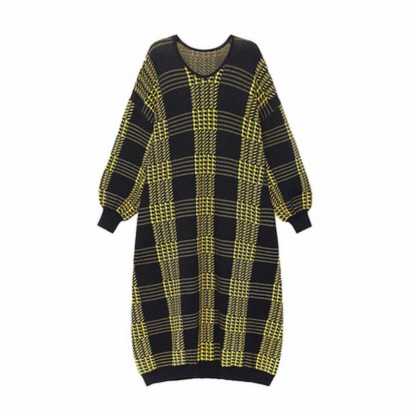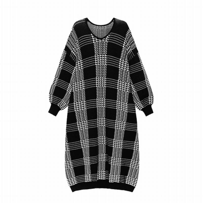 2カラー チェック柄 長袖 Vネック ワンピース *on821