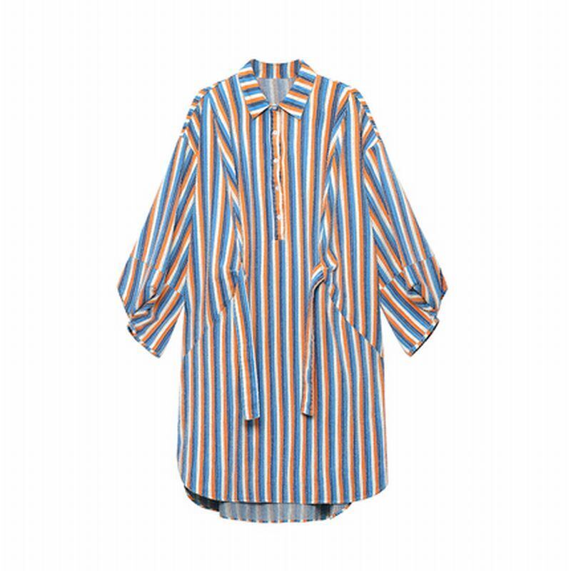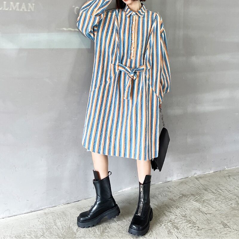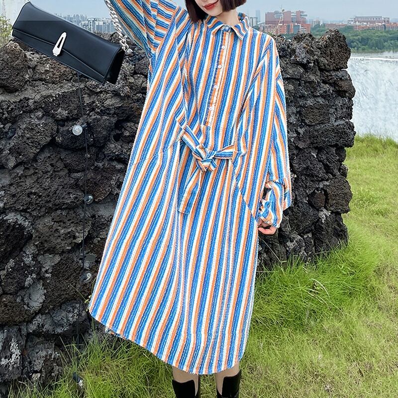 ストライプ リボン ロング 長袖 シャツワンピース *on823
