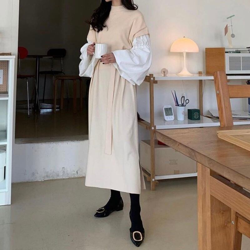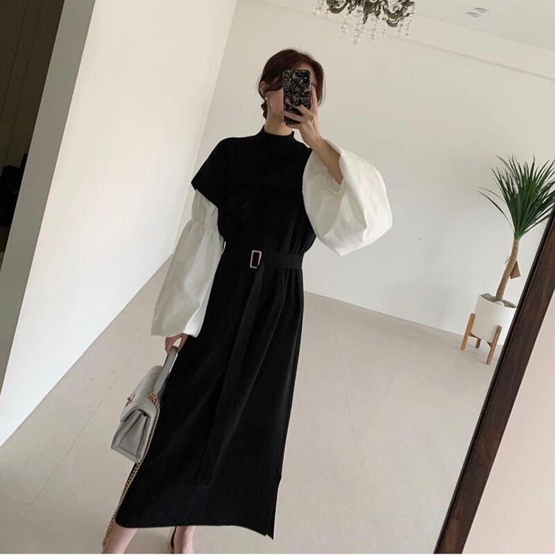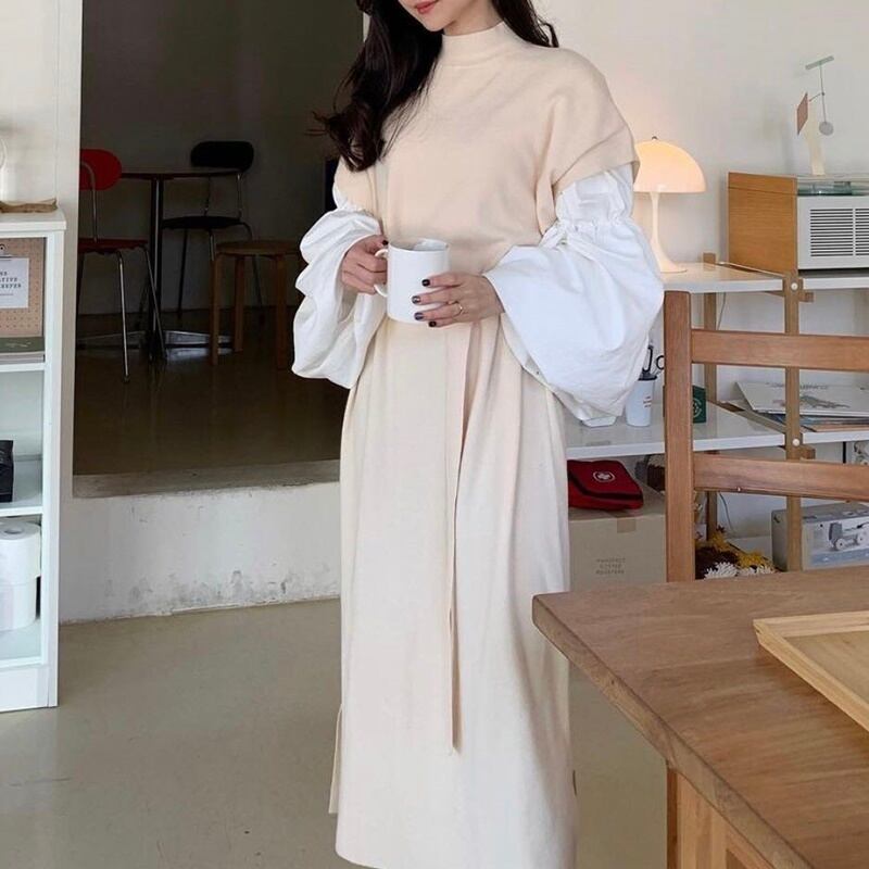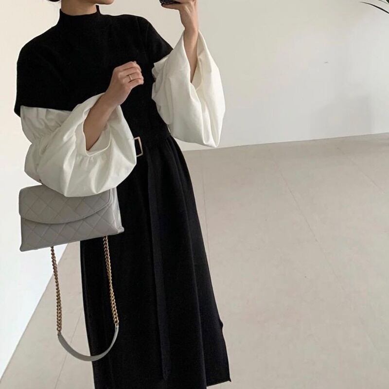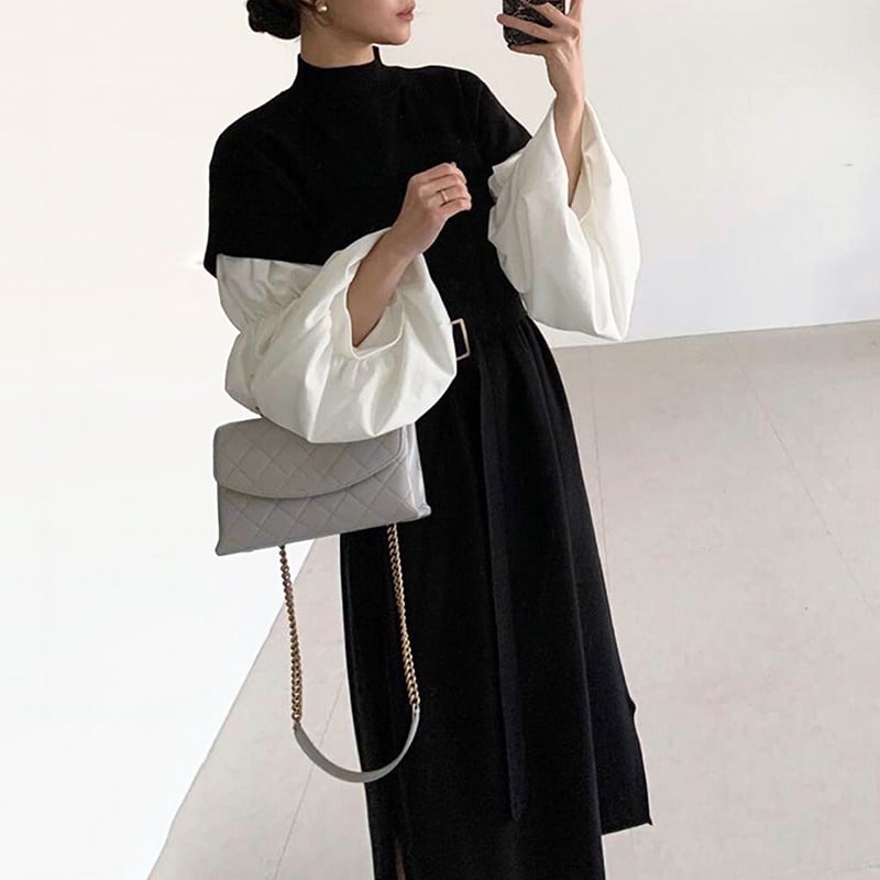 2カラー フェイクツーピース ボリューム袖 長袖 ワンピース *on846