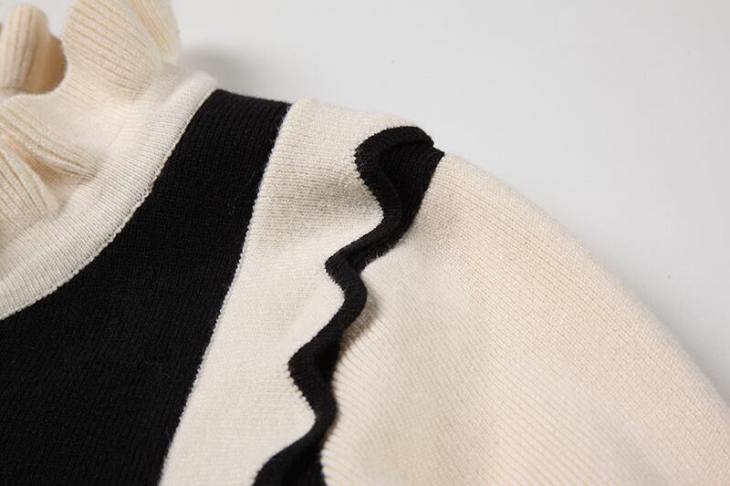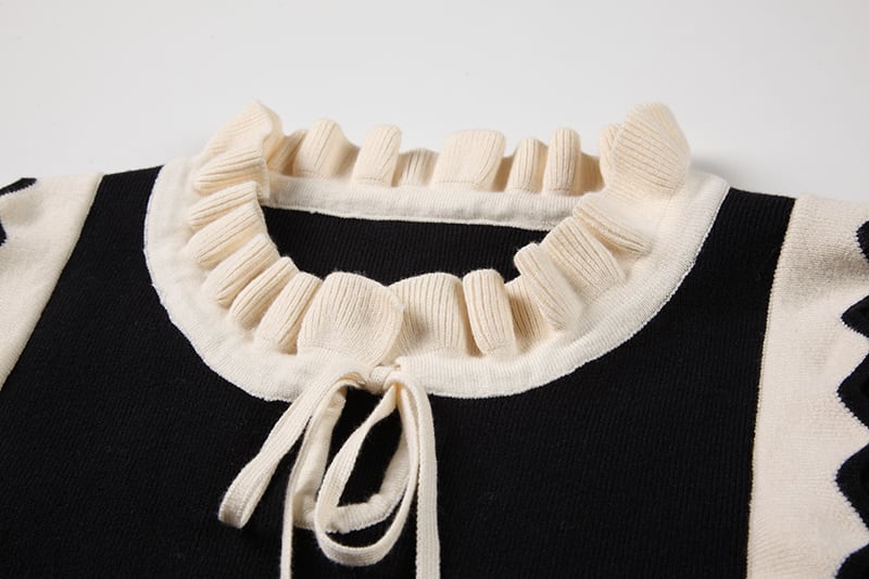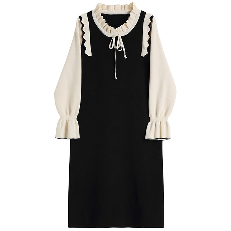 フリル リボン 切り替え 長袖 ニットワンピース *on860